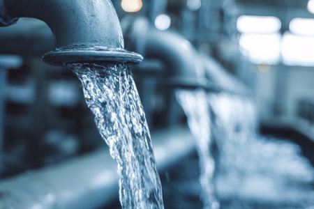 A clear stream of water flows from a metallic pipe in an industrial setting, highlighting modern manufacturing practices with soft focus and glowing background.