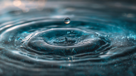 A close-up image showcases a water drop suspended above the surface, creating concentric ripples. The scene features shades of blue, and the lighting highlights the water's texture. This photograph could be utilized in various contexts such as advertising, educational material, or for artistic applications.
