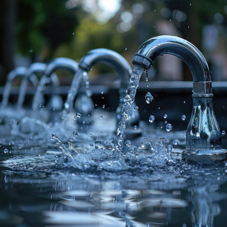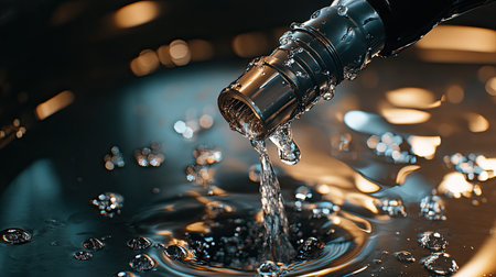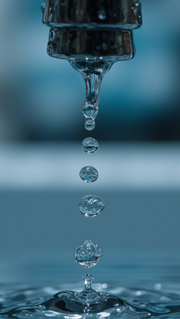 Captivating close-up of water droplets splashing from a metal faucet, showcasing fluid dynamics. The calm surface captures reflections, creating a serene and refreshing ambiance.