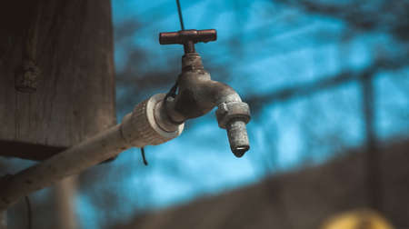 Old tap outdoors with the water drops