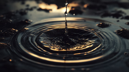 A stunning close-up of a water droplet creating ripples on a serene water surface during sunset. The mesmerizing beauty showcases natures fluid motion and tranquility.