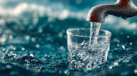 A stunning silver faucet pours clear water into a calm, blue surface, creating ripples and bubbles. The background features a refreshing, vibrant tile pattern. Transparent.
