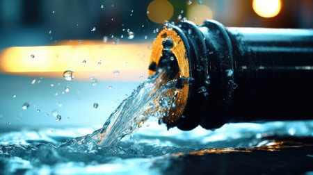 Clear water pours from a pipe against a dark background, creating a dynamic visual. The image highlights the fluid texture and transparency of the water, with droplets splashing. The composition suggests an outdoor or industrial setting, suitable for illustrating themes related to resources or technology. This image can be used for various commercial or editorial applications.