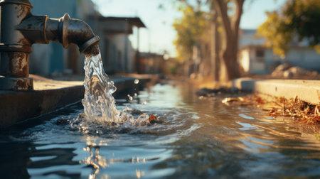 This captivating image showcases water splashing from a pipe, creating dynamic ripples on a wet street surface, with urban scenery in the background.
