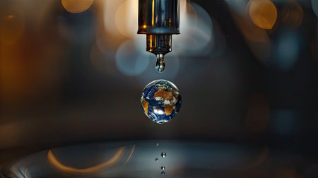 Save our planet: Witness a dripping tap with one drop resembling planet Earth, advocating for water conservation and environmental sustainability