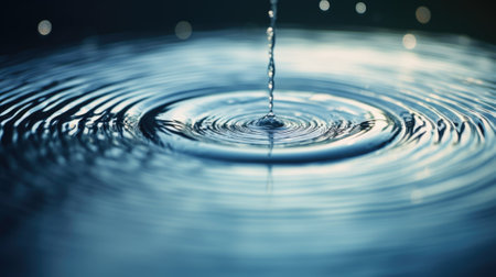 Water droplet creating ripples on a reflective surface, close-up view. Serenity and nature concept