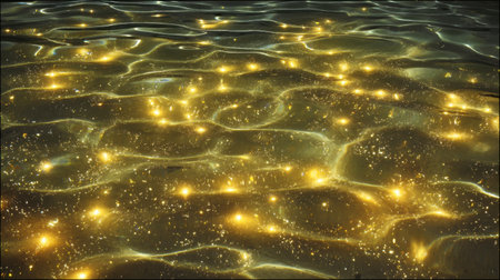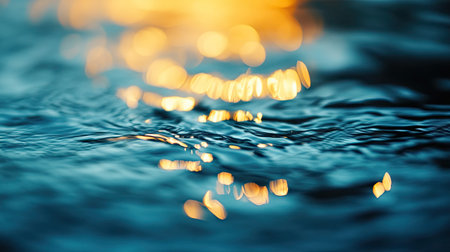 Shimmering surface of water reflects golden hues, creating mesmerizing pattern of light and movement. tranquil waves evoke sense of calm and beauty in nature