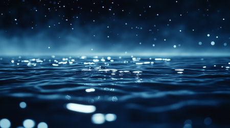 A serene and peaceful scene of water droplets falling into a blue body of water at night, creating a soothing ambiance with a dark background and bokeh lights.