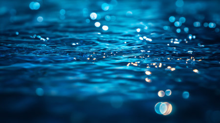 Close-up of a rippling blue water surface with bright bokeh lights, creating a vibrant and dynamic effect with shimmering highlights.