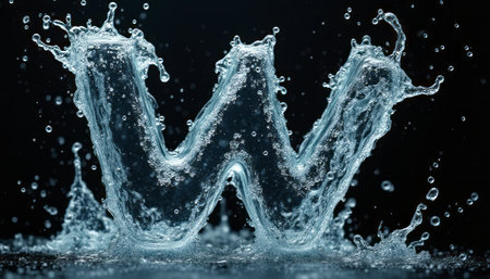 A stunning splash of water creates the letter W, surrounded by vibrant droplets and bubbles against a dark backdrop. This captivating image embodies energy and creativity, making it perfect for branding or artistic projects.