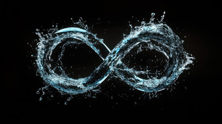 This striking image depicts a splash of water forming an infinity symbol, set against a dark background. It embodies the concepts of continuity and flow in nature.