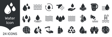Water Conservation And Usage Solid Icon Set. Hydration, Recycling, And Environmental Protection Silhouette Symbol Collection. Water Management And Sustainability