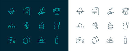 Set line Water jug with filter drop Big bottle clean water Test tube Washing hands soap Iceberg and Shower icon. Vector.