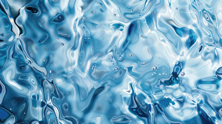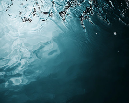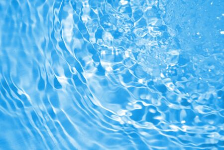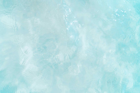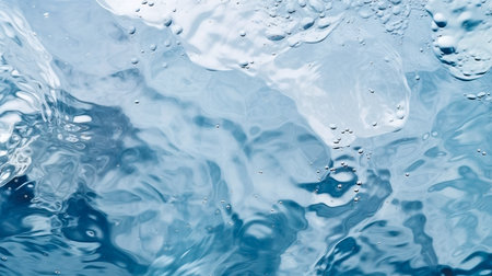 Transparent blue water with ripples and defocused texture, shimmering reflections of light. Calm surface with bubbles and subtle splashes creating beautiful patterns.