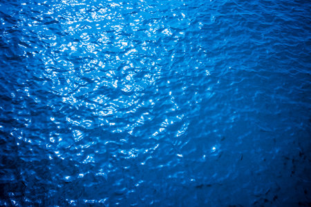 Close up of blue water surface with ripples and sun light.