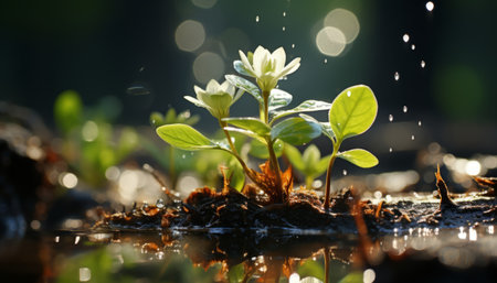 Green seedling growing out of soil with water drops and bokeh. AI generation