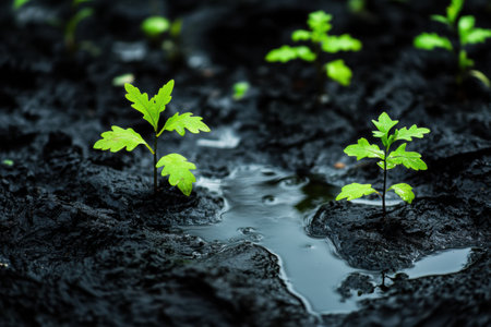Bright green plants grow through patches of spilled black oil, highlighting natures resilience in a polluted setting of unexpected beauty.