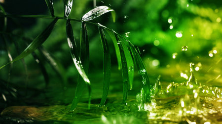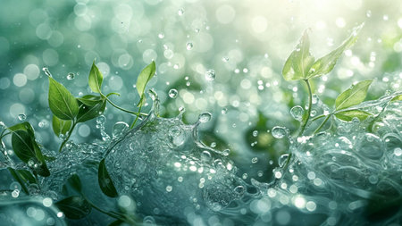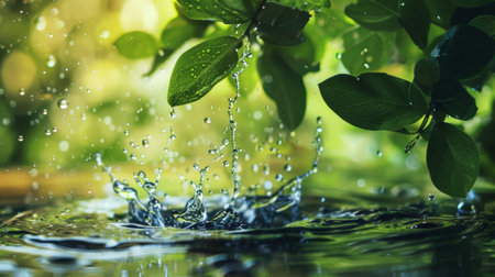 Water splashes with leaf elements, nature-inspired clean background. Generative AI