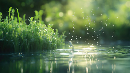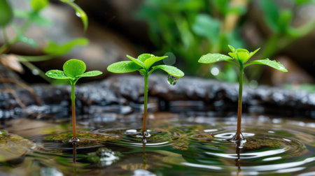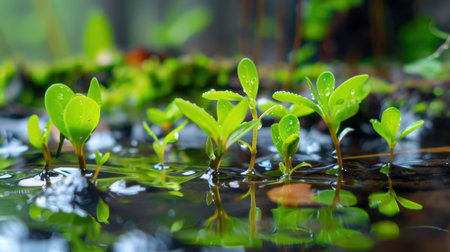 Vibrant green seedlings emerge from tranquil water, adorned with dew drops that reflect nature's beauty, showcasing growth and environmental harmony.