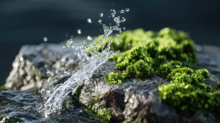 A captivating close-up image featuring water splashing against a moss-covered rock, showcasing the beauty of nature's elements in a tranquil setting.