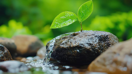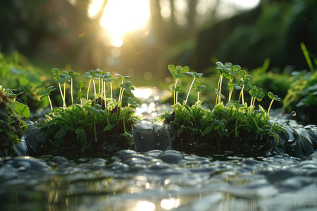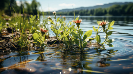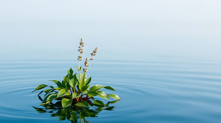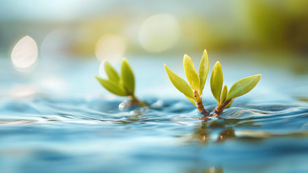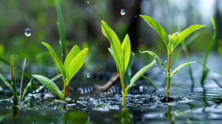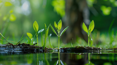 Vibrant green plants rise above a reflective water surface, symbolizing nature's resilience and growth. The soft focus backdrop enhances the serene atmosphere, inviting viewers to appreciate the beauty of the natural world.