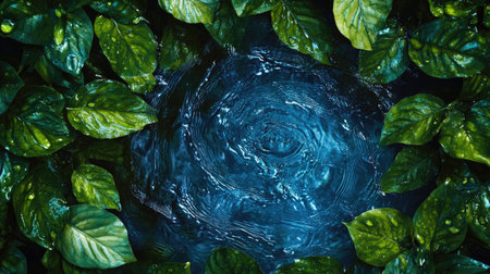 A stunning top view of swirling blue water surrounded by vibrant green leaves, creating a tranquil and refreshing natural scene perfect for various themes.