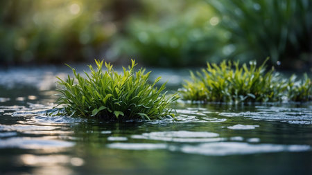 This image depicts tufts of lush green grass floating on the serene water of a pond surrounded by verdant greenery, highlighting the tranquil and peaceful beauty of nature in a calm setting. AI generated image