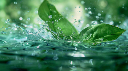 A vibrant close-up of fresh green leaves splashing in clear water with droplets suspended in motion, highlighting nature's vitality.