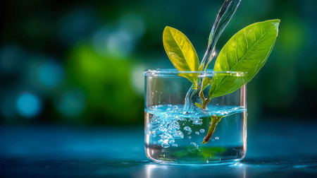 Fresh green leaves in a glass beaker as water is poured in, clean eco science concept with bubbles and soft bokeh background.