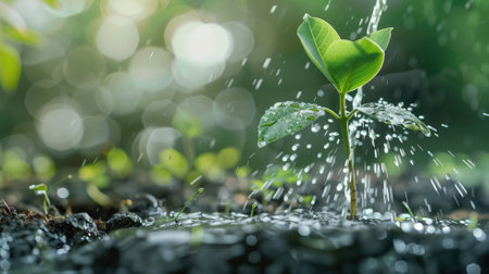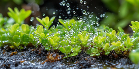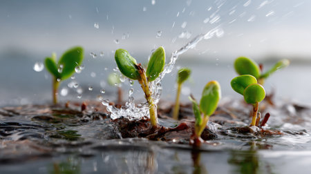 Vibrant green seedlings emerge from rich soil, surrounded by refreshing water droplets, showcasing the beauty of nature's growth and vitality.