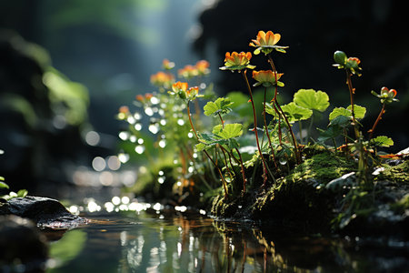Flowering plants in a small stream in the forest. Selective focus.
