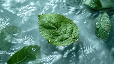 Refreshing green tea leaves resting on water, embodying calm and delicate aroma