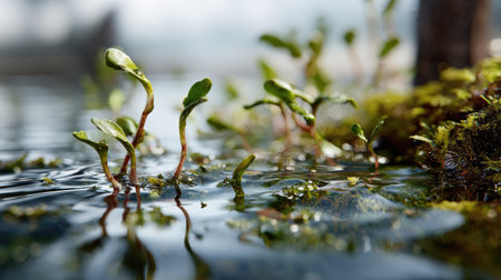A serene image of vibrant green seedlings emerging from calm water, showcasing nature's beauty and growth in a lush environment. Ideal for themes of life, ecology, and sustainability.