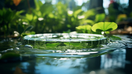A pond with water lily leaves and a small drop of rain, AI