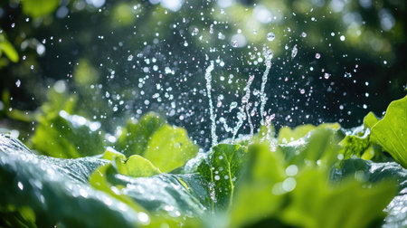 Water droplets splashing off a large leafy plant in a summer garden, creating a refreshing scene on a hot sunny day
