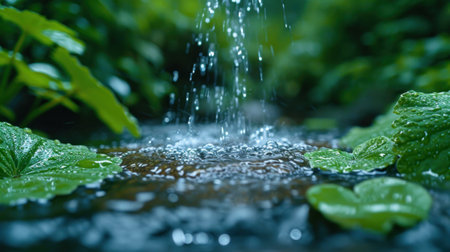Escape to a tranquil spring countryside scene Hear leaves rustling in a serene forest, alive with birdsong A water feature, adorned with leaves and droplets, invites peace and reflection Vibrant foliage paints a breathtaking picture, perfect for relaxation and meditation, where calm reigns supreme AI Generative