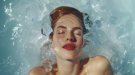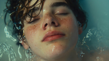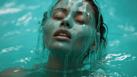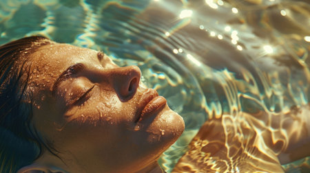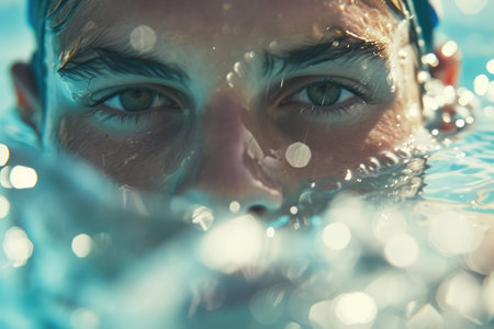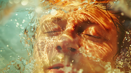 A striking close-up of a young womans eyes breaking the waters surface, capturing a serene and mesmerizing moment filled with emotion.