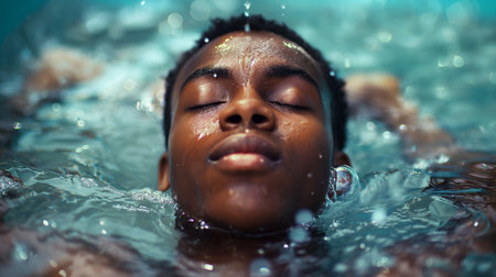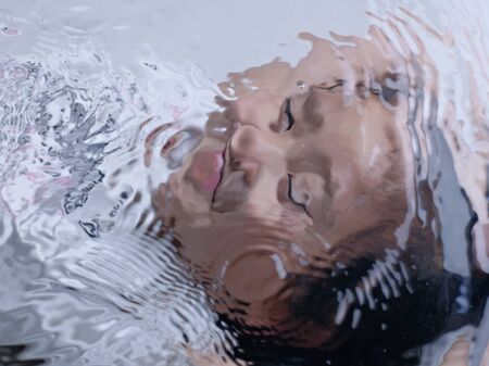 Beautiful woman floating in tank filled with dense salt water used in meditation, therapy, and alternative medicine. Close up