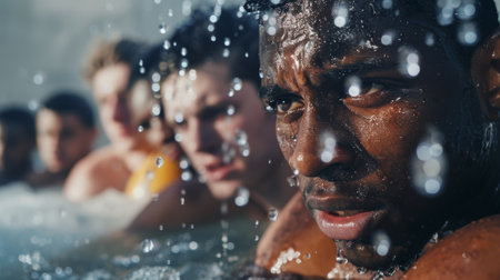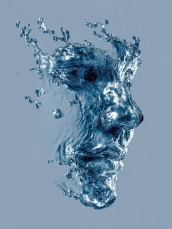 A dynamic portrait crafted from shimmering water droplets and splashes, capturing movement and change amid a tranquil blue hue.