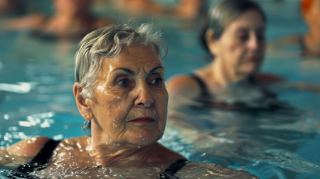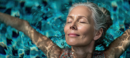 Therapeutic exercise in the pool. Woman receiving an aquatic therapy in the pool. Water relaxation and deep meditation.
