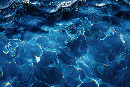 Closeup Transparent blue clear water surface texture with ripples. Abstract​ of​ surface​ blue​ splashes and bubbles​ water waves reflected​ with​ sunlight​