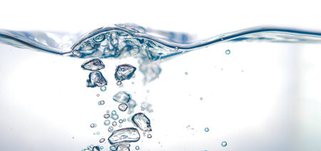 Water splashes with bubbles. Fluid in motion. Selective focus. Close up and horizontal orientation.