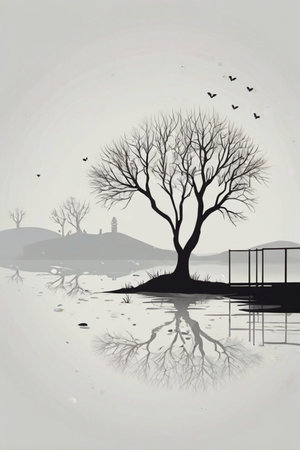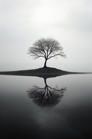 A solitary, leafless tree stands in still water, its perfect silhouette reflected on the rippling surface. This dramatic black and white image evokes a sense of quiet contemplation, resilience, and serene solitude, symbolizing strength and survival against the odds in a minimalist, atmospheric landscape.
