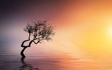Tree on the lake at sunset. Beautiful summer landscape with tree on the lake