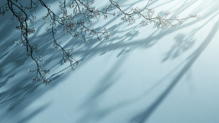 Minimalistic abstract gentle light blue background for product presentation with light and intricate shadow from tree branches on wall.