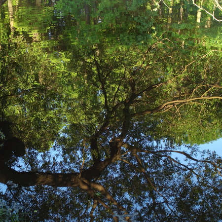 Trees are reflected in the water. Summer, park. Reflection in water. Abstraction.