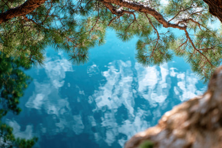 Tree branches framing a view of the blue sky reflected in a calm body of water.