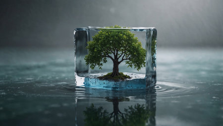 Tree inside a melting ice cube. Nature concept. Environmental protection and global warming idea. Copy space.
