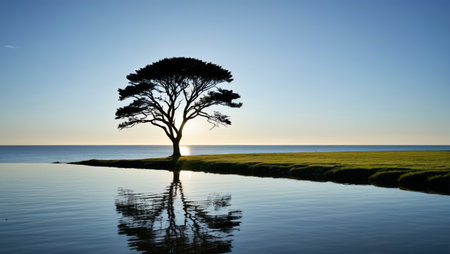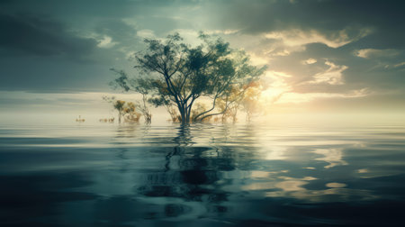 A solitary tree standing in still, reflective water at sunrise, mist hovering above the surface, creating a serene and peaceful atmosphere