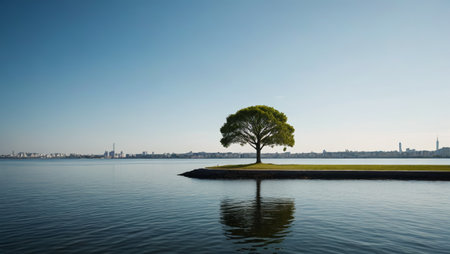 A breathtaking view of a solitary tree standing on an island surrounded by serene water, reflecting the beauty of the clear blue sky.